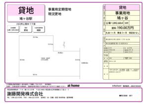 | 備考 | 保証委託料:初回1ヶ月(毎年賃料の10%) 仲介手数料:1ヶ月+税 事業用定期借地(最低10年) |